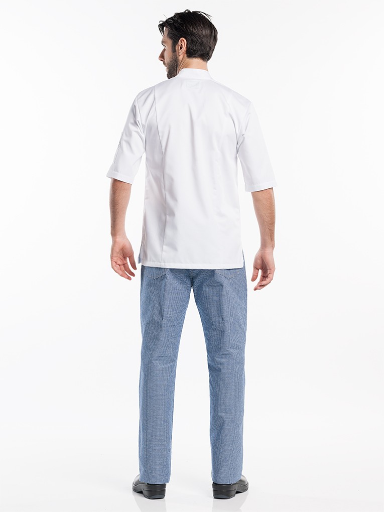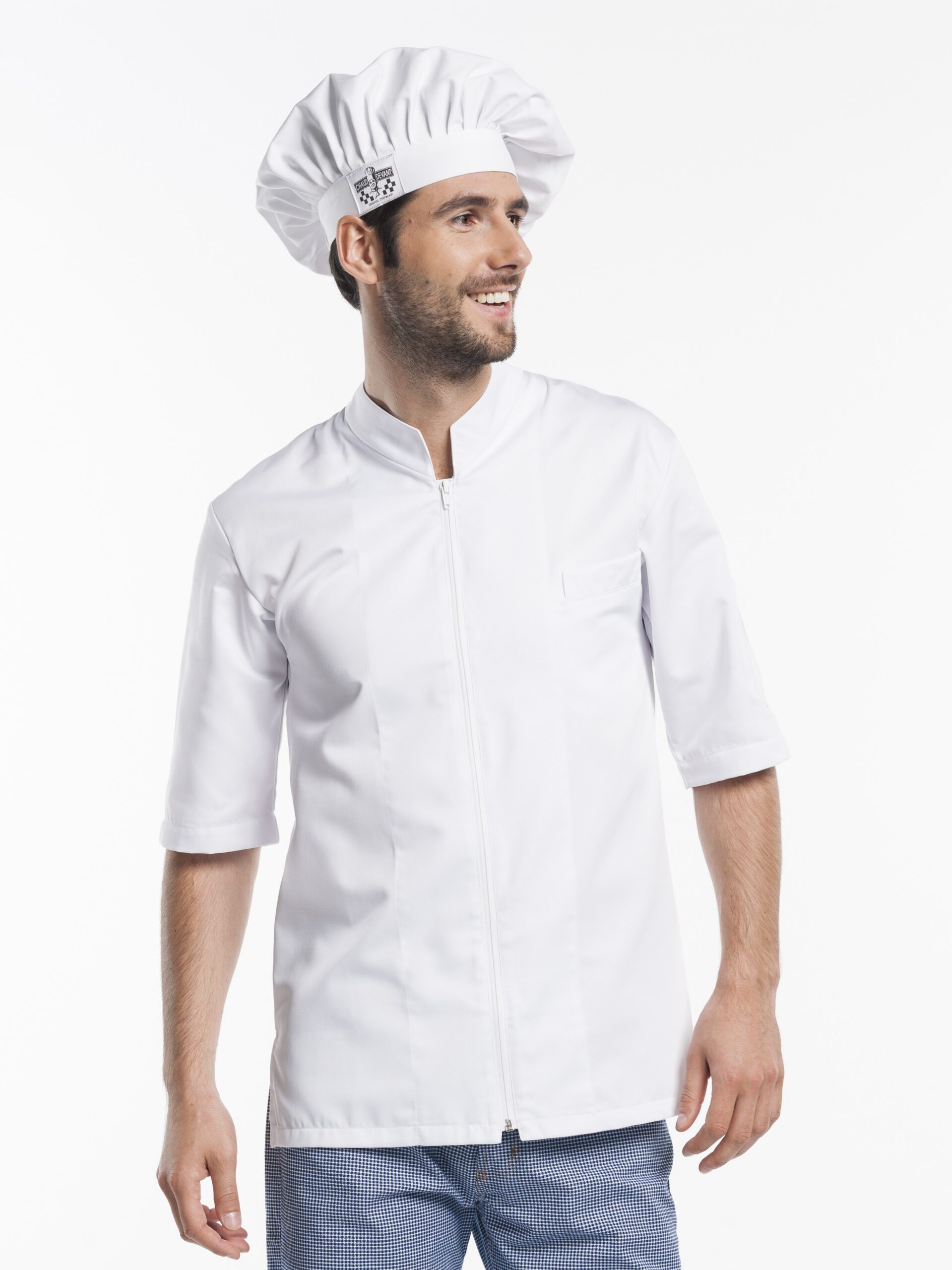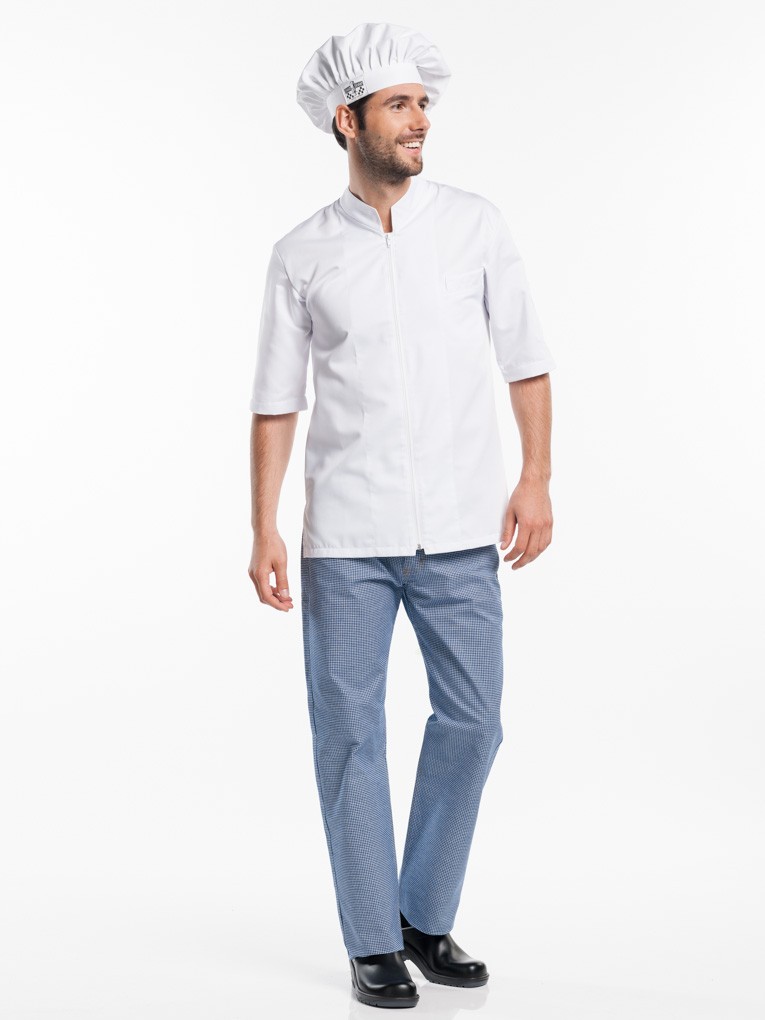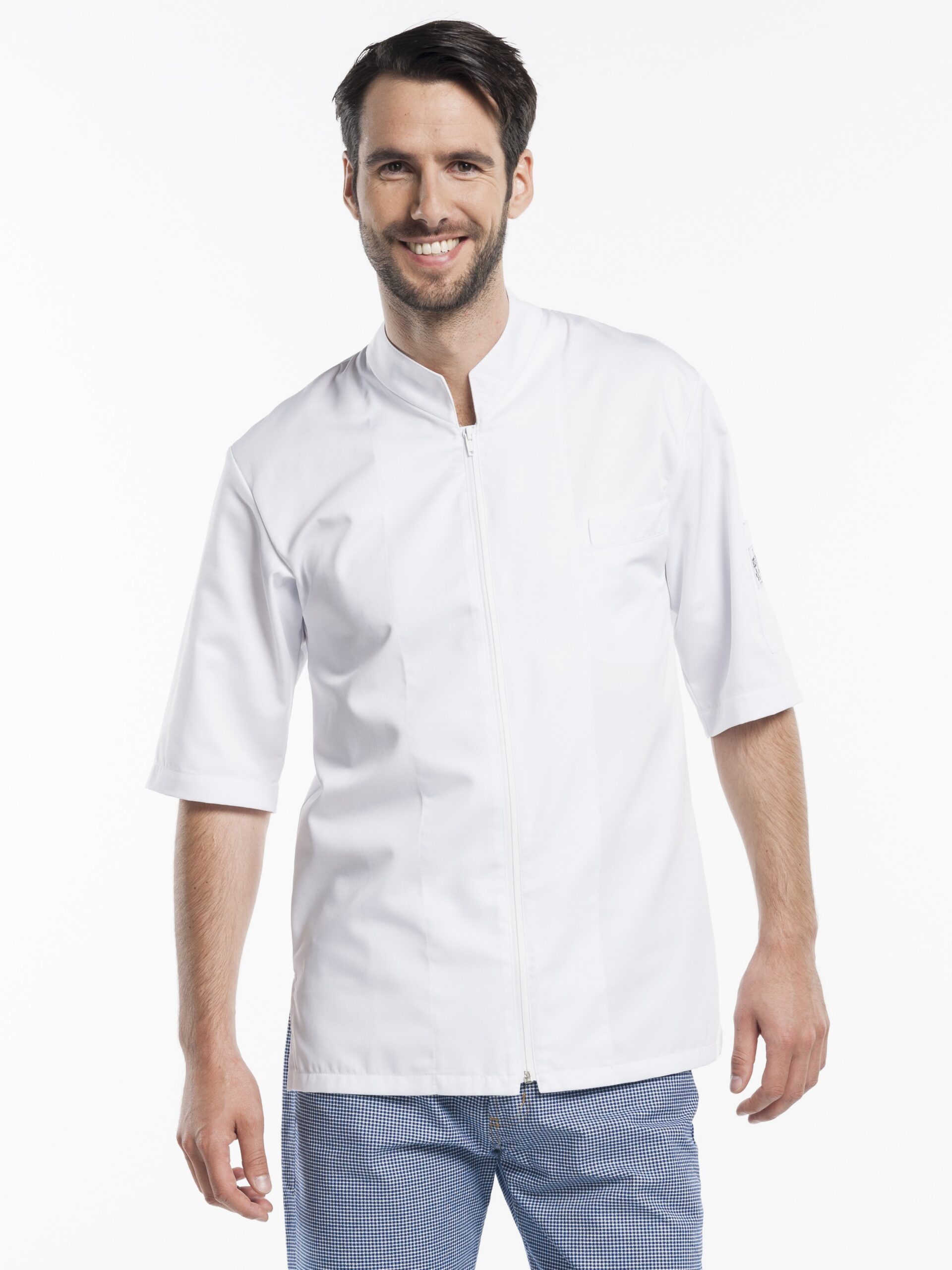 Modernne kokajakk lühikeste varrukatega, lukk-kinnitusega, rinnal ja varrukal tasku. Satiin Cooltex materjal laseb jakil hingata ja tagab mugavuse ka kõige kiiremal tööajal. Kerge triikida, külgedel lõhikud,sirge lõikega. Saadaval ka pika varrukaga.