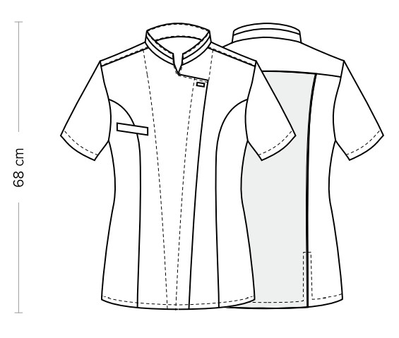 Lühikeste varrukatega naiste kokajakk, mille paremal pool on rinnatasku. Kraed kaunistab iluriba, kinnitus peidetud trukkidega, va ülemine ilutrukk. Kokajakil kaks lõhikut ning seljaosal võrkriba, mis annab hingavust. Slim Fit.