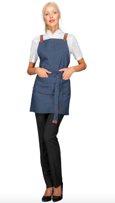 Laos Naiste Mexico Jeans põll, mille esiosa keskel on kaks taskut. Kaelapael on nahast ning reguleeritav ja seljal ristuv. Sobilik teenindussektorisse.
