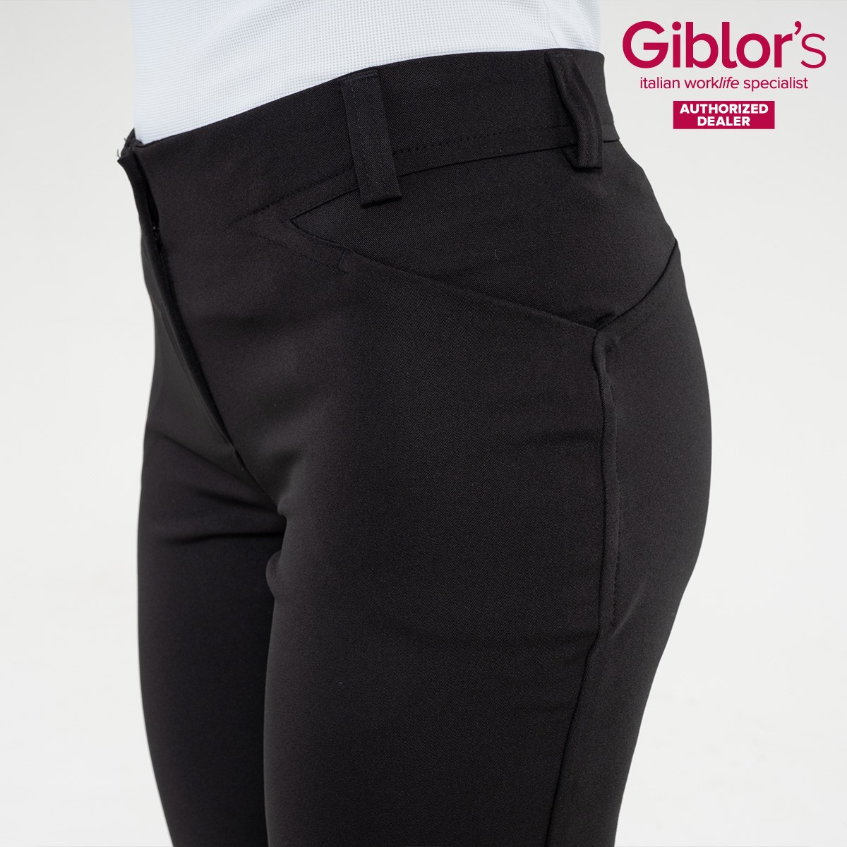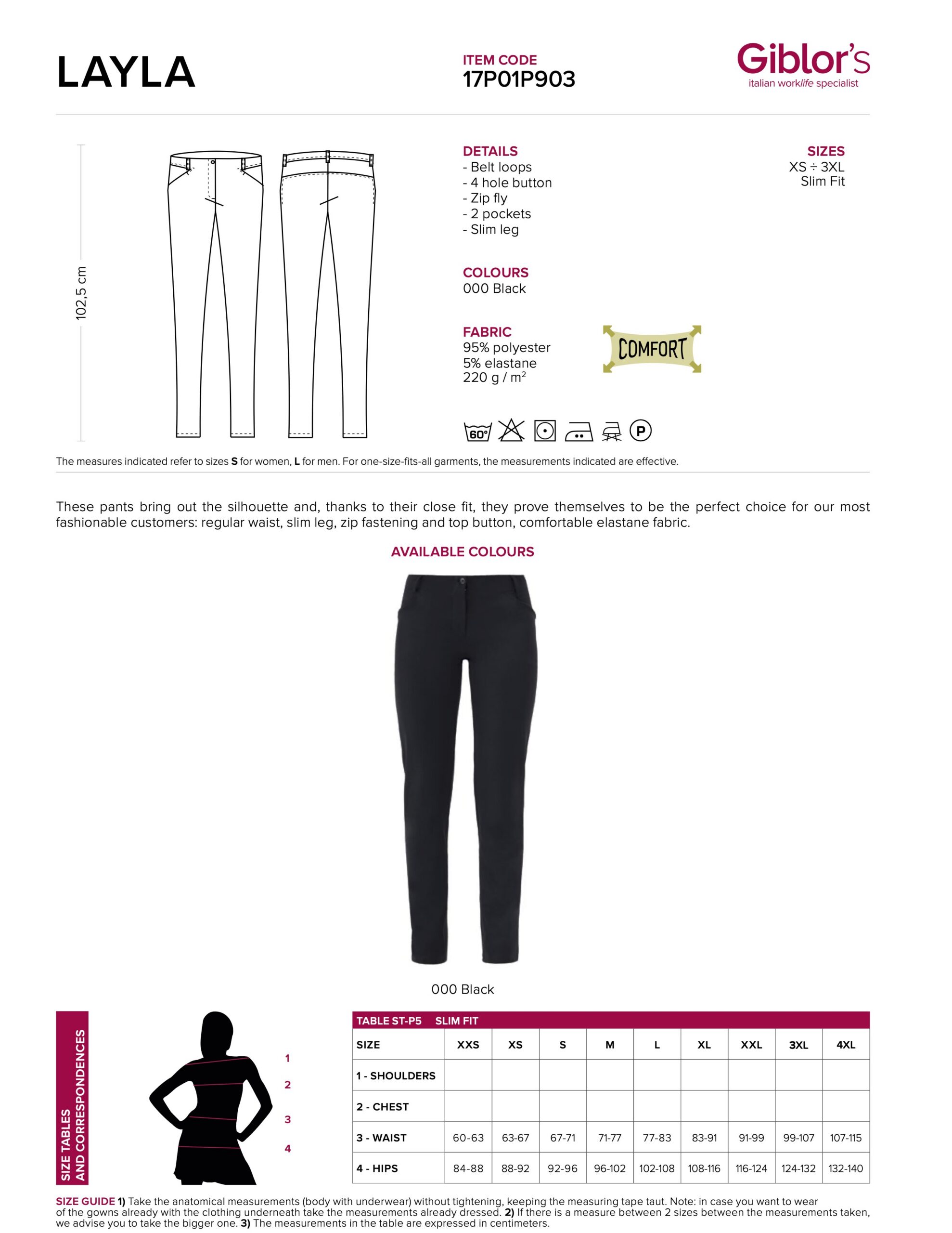 Laos Kitsa lõikega naiste püksid, millel madalam vöökoht. Pükstel tõmblukk ning nööp. Tänu elastaanisisaldusele on kangas mugav kanda. Ees kaks taskut. Tegemist pigem laiema puusalõikega pükstega.