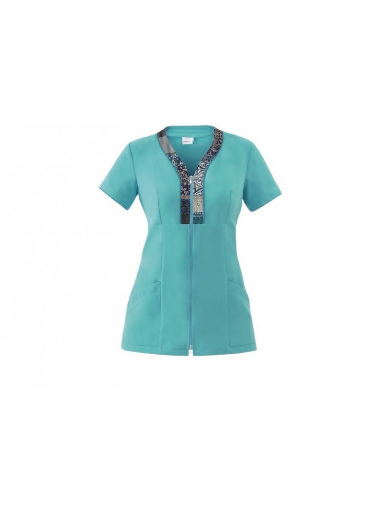 Naiste tuunika, sobib iluteeninduse- ja meditsiinitöötajatele. Värvilise kandiga, kinnitus lukuga, värv aqua.