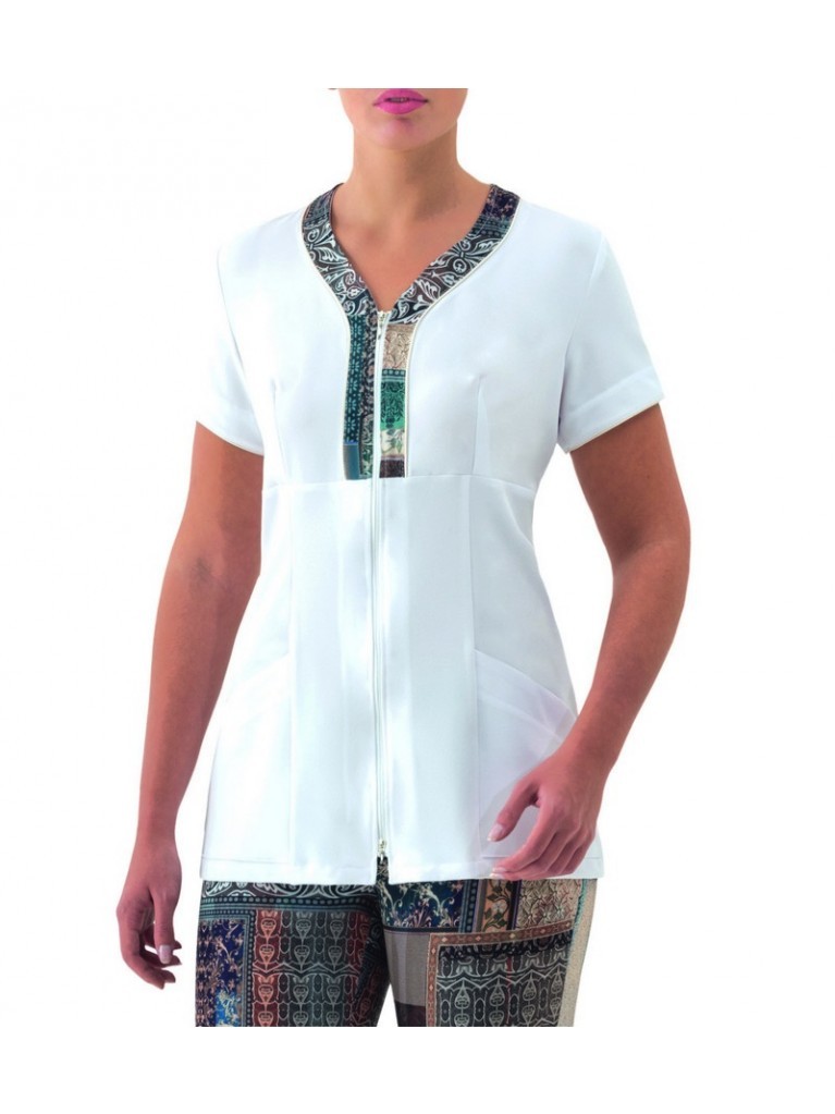 Naiste tuunika, sobib iluteeninduse- ja meditsiinitöötajatele.Krae ääristatud kirju kandiga,kinnitus lukuga.